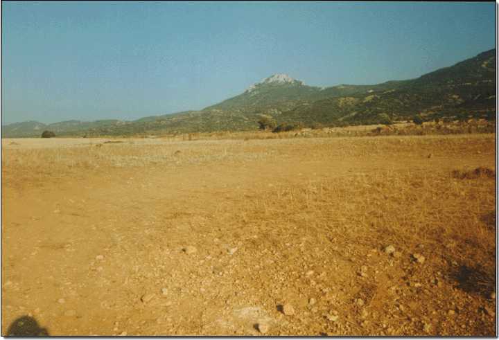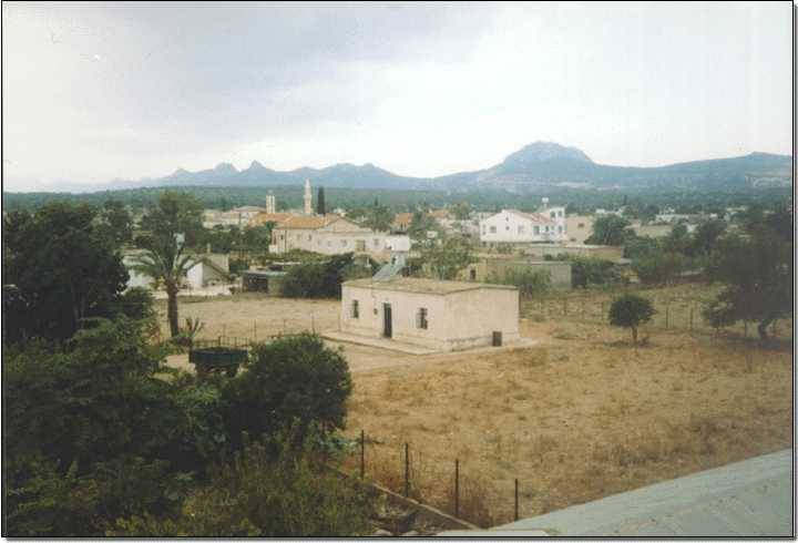 The setting of the village is such that the mountain range gives a beautiful outline in the north from this angle. The closest mountain-top is that of Ais Fotis. Here we can also see the co-existence of the mosque and the church. They are reciprocal. I am sure that people of both religions gave greetings to one another on their way to their place of worship and must have had respect also for their neighbours. The picture on the right is of the mountain-top of Ais Fotis but from the other end of the village.  |