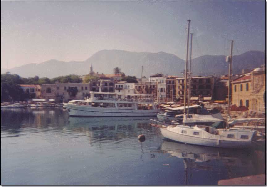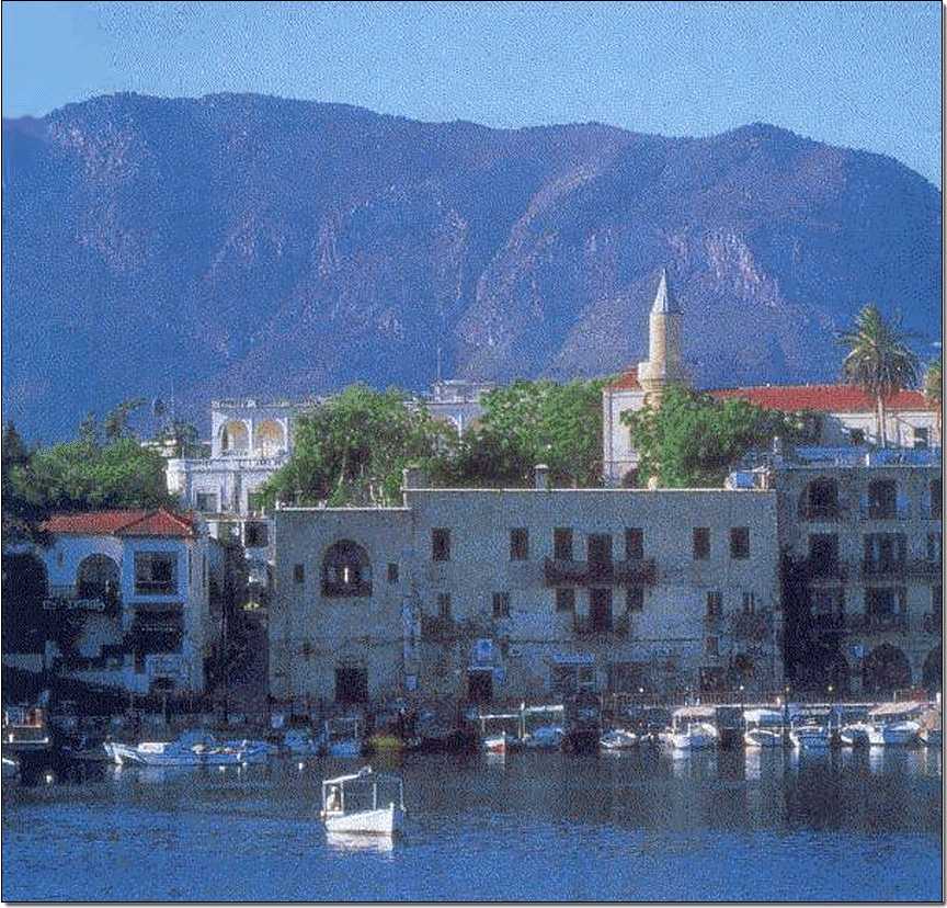 These two photographs show the little harbour and the promenade with the Pentadaktylos mountain range as background