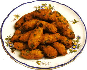 Children love these . 350 gr. minced meat (either beef or half beef/half pork) 2 medium potatoes or one very large one 1 egg 1 large onion A handful of chopped parsley or mint Some flour Salt , pepper and a little cinnamon (optional) I level teaspoon baking powder Fat or corn oil for frying |