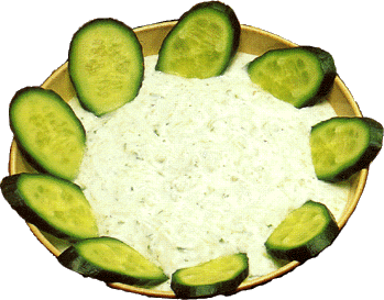 Peel the cucumber and cut into four , or eight lengthwise , the slice as thinly as possible . Crush the cloves of garlic and mix with the cucumbers (or rub bowl with one clove) . Let stand a little and then squeeze out the liquid the cucumbers have yielded . Rub the mint into the salad and add salt . Beat the yoghourt and pour over the cucumbers , mix , add a little olive oil . Refrigerate and serve very cold . Cucumbers in any form go very well with ouzo , on a hot summer evening ! |