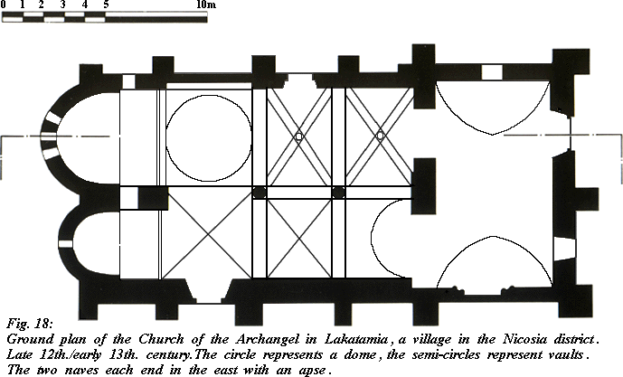 These pendentives meet together with the corners not resting on the pillar , thus describing a circular line on which then the hemisphere of the dome either rests directly or supported by a tambour (cf. Fig.18) .This construction permits the inclusion of numerous windows through which light can flow into the sacred area and can be employed in a variety of ways . It can also be combined with the basilica type , as in fig. 18 above . The mosaics serve the same purpose . They are based on a tradition dating back to the 5th. century before Christ . These were brightly coloured pebbles which were laid out on a floor initially to form geometric-floral motives , later also as complete picture compositions . This decoration was also used in the early Christian basilicas (fig. 19) , but not continued after the 6th. century ; so much attention was no longer paid to the floor . The mosaic art lived on particularly as wall decoration . In this way it was possible to imitate valuable tapestries and reduce the heaviness of the walls . Just as in the case of the domes , one wanted to avoid a massive , oppressive impression . With pieces of coloured glass , which could also be backed by gold leaf , and mother-of-pearl , light materials were found which held to the still moist mortar against the force of gravity in the vertical and namely also in the dome or the semi-dome of an apse . Artists soon learned to compensate for the effects which come about through domed surfaces by distorting the drawing correspondingly . They took account of the optical refraction of the mosaic stones and set them at certain angles to one another in the plaster . This technique could lead both to works of the priestly , ceremonially reduced style , known as hieratic (fig. 176 , 199) and to an enraptured illusionism depicting the holy persons naturalistically and yet full of allusions so no doubt about their removal to heaven (fig. 20) . Where sufficient money was available for these lavish murals , preference was given to mosaic art . Their existence always indicates the presence of a patron who commissioned them on behalf of the state . If it was necessary to manage with more modest means , then it was possible to fall back on frescoes which had similar , tapestry-like effect , albeit nothing like so magnificent . As Cyprus was at that time one of the richest and most peaceful provinces , it is possible to find relatively many remains of mosaics from that period here (cf. Kiti , Lythrankomi) In the 6th. century , the stylistic characteristics of Byzantine art are clearly marked . The frontal presentation of the main figures brings about a distancing ; the emphasis on the lines is an abstraction , a denaturalisation corresponding to the Christian hope for the vanquishing of earthy things . Many of the schemes of the later canonical plan of composition , such as Mary Orans between the Archangels Michael and Gabriel are already fully developed and change only in details . The pictorial programme As a result of the repulsion of iconoclasm , the number of theologically fixed composition schemes rose and their place within the church was fixed . With this is linked , of course , a check on the painters by the bishops . Their work was regimented by numerous rules . At the end of the development were the painters' manuals of the 16th. century , the oldest of which was ascribed to an author who had lived one hundred years earlier , a certain Dionysios of Phurna , thus backdating it to 1468 to give the work greater legitimacy . The definition of the thematic distribution of pictures envisages that Christ Pantocrator dominates in the dome (the representation of heaven) . Beneath him , the four archangels , the choir of angels with cherubim and Preparation of the Throne and the twelve prophets of the Old Testament form the transition to the earthly . The transition is reached with the four Evangelists who belong in the pendentives . Supporting architectural parts are reserved for saints , monks and bishops as representatives of the earthly church . In addition to this vertical arrangement , there is also a horizontal one telling the story of Christ's life and sufferings starting out from the apse ; in the eastern half , the Annunciation and Birth of Christ , in the west the Crucifixion of Christ and the Dormition of the Virgin ; in between , the New Testament cycle develops in the traditional sequence . By comparison with the West , iconoclasm led to a greater emphasis on the incarnation of Christ which was the main argument against the iconophobes : A man may be portrayed , Christ became man , so anyone not believing in the portrayability of Christ denies His incarnation . The veneration and portrayal of the Virgin Mary are based on this teaching and were adopted by the West with a certain delay . Come to that , major impulses for the art of northern Europe came from the East through the then still for the most part Byzantine Italy . This is especially true for the age of the Saxon emperors during which Byzantine art experienced a brilliant climax under the Macedonian and Komnenian emperors , to match which the West had nothing comparable to offer . The art of the Komnenes The political and economic upswing in the 10th. and 11th. centuries permitted the construction of numerous new churches . Over 200 were constructed in Cyprus alone until the year of the Latin conquest (1191) , 40 of which are still more or less well preserved until today with their fresco decoration . Following the model of Constantinople , the 'inscribed cross' became a particularly frequent ground-plan type . In this , a cross with equal arms is extended by a square . A special development of this is the five-domed church in which each section of the cross bears a dome . More frequent are three-domed churches in which the nave is emphasised by domes . However , a hall church consisting of just a nave with a timber roof is typical for the Cypriot mountain region . 