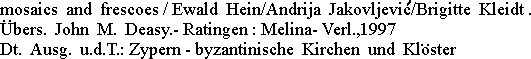 © Melina-Verlag, Ratingen 1998Am Weinhaus 6, D-40882 Ratingen/Deutschland The work has also been published in a German edition . All rights of distribution, also by film, radio, television, photimechanical reproduction, sound storage and recording media of all kinds and reproduction in excerpt are reserved . Cover picture : Fresco with the founders of the Archangel Michael Church in Pedoulas : Papacharalambos Chouris Organisation, photos(cf. Individual illustration credits), plan of the location of the churches and monasteries : Ewald Hein