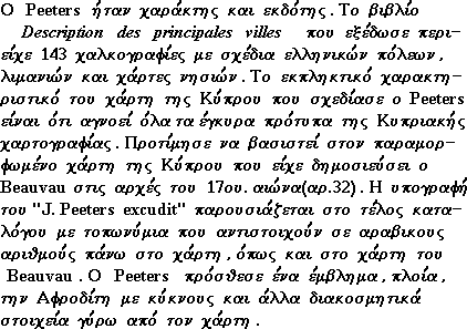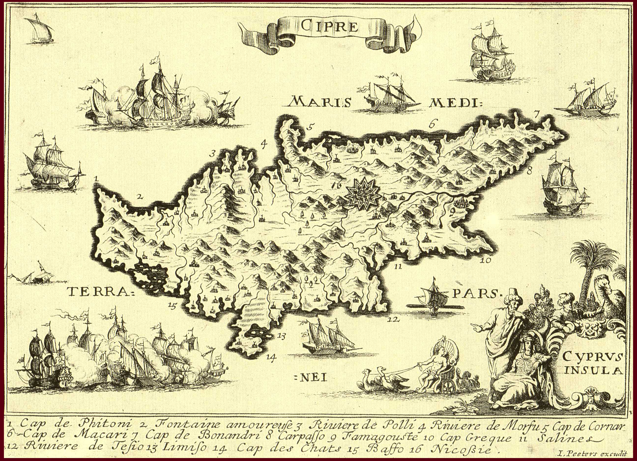 Peeters was an engraver and a publisher . His Description des principales villes... contained 143 copper engravings of Greek cities , harbours and islands . The amazing characteristic of his map of Cyprus is that it ignored all the valid prototypes of Cypriote cartography and chose to copy the deformed map of Cyprus which Beauvau published at the beginning of the 17th. century (Fig. 32) . His signature , "J. Peeters excudit", appears at the end of a list of place names that correspond to arabic numbers on the map , a feature also taken from Beauvau's map . Peeters added a cartouche , sailing ships , Aphrodite drawn by swans and other decorative features around the map . |