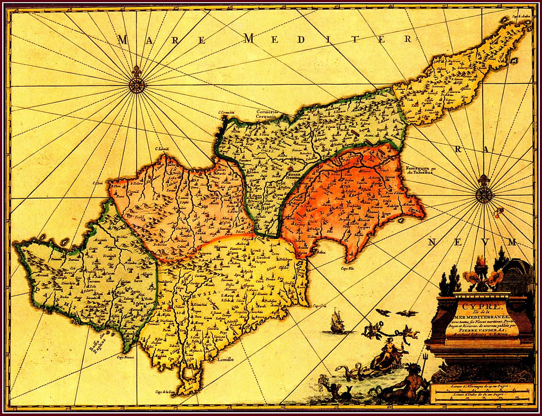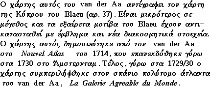 This map by van der Aa copies the Cyprus map of Blaeu (Fig. 37) . It is smaller in size and Blaeu's exquisite decorative treatment has been replaced by a cartouche and new pictorial motifs . The map was first published by van der Aa in his Nouvel Atlas (1714) which ca 1730 was re-issued in Amsterdam . Finally , ca 1729/30 the map was included in the very rare multi-volume atlas of van der Aa , La Galerie Agreable du Monde (Leiden) . |
