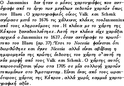 Janssonius was not the only cartographer guilty of copying maps by great cartographical publishers , like Blaeu . The cartographical house of Valk and Schenk , having obtained after 1676 copper-plates from Joannes Janssonius' heirs , worked the Cyprus plate . This had been made by Janssonius in 1637 when he copied Blaeu's original (Fig. 37) of 1635 . In this manner Nocosia seems to have been corrected to Nicosia but it is still uncertain when the map was first published by Valk and Schenk in this second , amended state . In any case , it is found in a collection of maps published ca 1705 in Amsterdam . It is a handsome map to look at , but of no cartographical importance . |