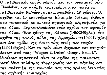This travel guide by the famous firm of Baedeker , the pioneers in the field of guide-books , includes 18 maps , 50 plans and 15 panoramas . It is a second edition in German and quite important as far as Cyprus is concerned . It includes three folding items on Cyprus : one map of "Cyprus" (146x240mm) , a plan of the old town of "Famagusta" (146x179mm) and a plan of "Nicosia" (144x148mm) within the walls . All three are coloured and signed by "Wagner & Debes' Geogr . Establ ." Of particular importance is the plan of Nicosia , the capital of Cyprus , because it gives valuable information as to its growth and development in the first decades of British rule . |