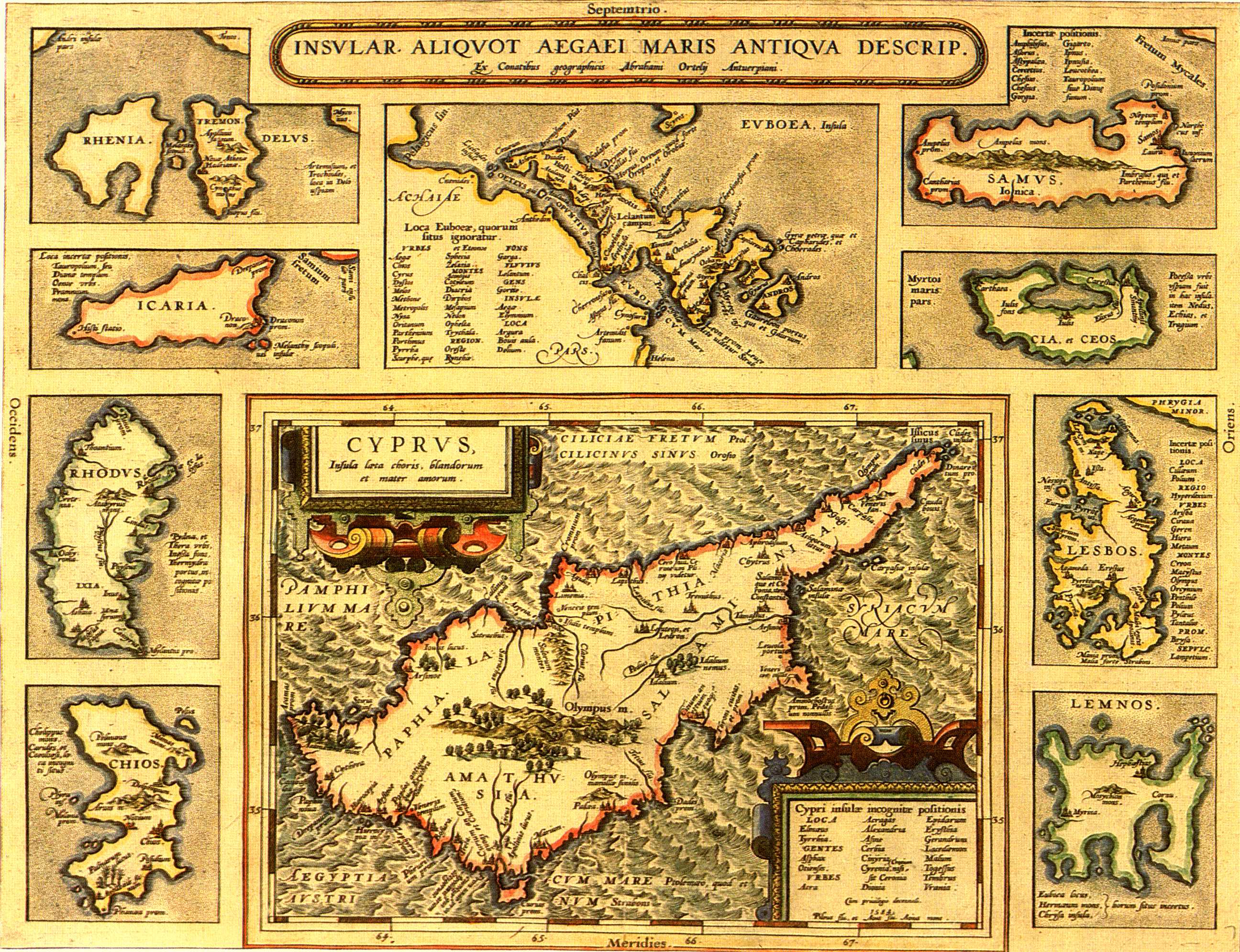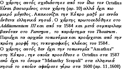 Drawn by Ortelius himself , this map is a reduced version of the map (Fig. 10) and shows Cyprus with nine insets of other Greek islands . It was first published by Ortelius in Additamentum III and as of 1584 it was included in the Parergon , a supplement to the Theatrum . The map contains ancient toponyms . The present edition comes from the original of 1584 (see also Fig. 11 of 1608 after the place name "Amathus" was added on Cyprus (1587) and "Melanthy Scopuli" deleted from the Greek islands (ca 1600) . |