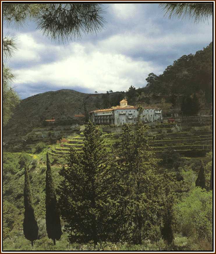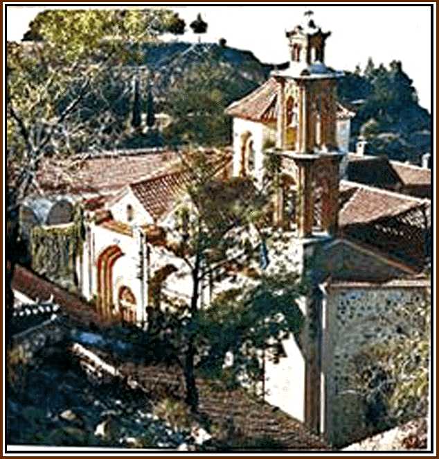 The monastery is surrounded by fresh air ; one well inside the walls and another outside supply healthy and fresh water . It is , it is true , located in a remote spot , but through its wide - spread fame the ungodly Moslems do not cease to call on the monks in order to frighten them . In the main aisle of the church , a small icon of the miraculous Mother of God encrusted with gold and silver is to be seen . This icon portrays the Virgin without her child with her hands raised in prayer - in the same way as I would draw her . ' Both in the period of Turkish rule and later , the monastery was well - known as a centre of the national intellectual life of the Cypriots . Just as elsewhere in the Christian world , a school was opened there in the 19th. century . Cyprus's folk medicine was practised mainly by the monk physicians Metrophanes and Charitos from Machairas . Metrophanes is known as the author of an 'Iatrosophion' , that is to say a work on the theory of medicine . In addition , especially in the recent past , the monastery was a centre for the production of liturgical books . Many of the works which came into being here are kept in the monastery library and the treasury . The frescoes in the main part of the church were painted by Charalambos and Panagiotis Voulgaris from Amaliada in Greece in 1993 ; the mosaics on the right and left of the main portal of the church are by the contemporary Cypriot artist Arestis Stasis .  |