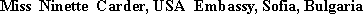 Miss Ninette Carder, USA Embassy, Sofia, Bulgaria |