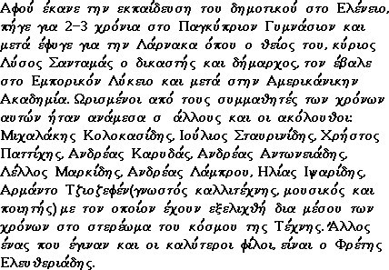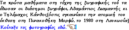 The first teachings in the art of painting were given by the celebrated masters, Adamantios Diamantis and Telemachos Kanthos(who inaugurated an exhibition of his work on June 5th.1980 in Nicosia). |