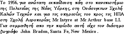 As of 1956, for the higher education, it was at the State University of New York, Washington School of Art and for the services of the United States, the McIntyre School of Flying at McArthur Airport Base in Long Island. Of this period he had John Brandon (famous painter, now of Santa Fe, New Mexico) as class-mate. |