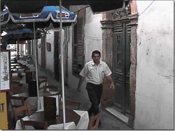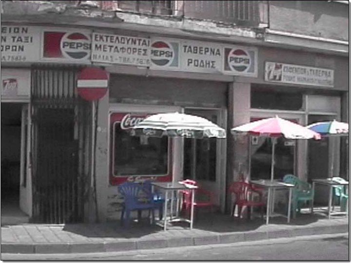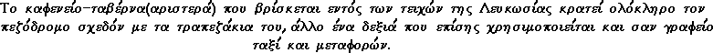 This café-taverna takes up most of the street in the heart of the old city . Another one on the right which also has a taxi-transport office within.
