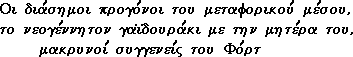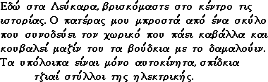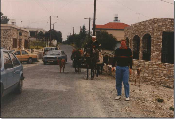 Here (at Lefkara) we have a very complicated picture . I will try and simplify it a little: My father is standing in front of a dog who is the escort to the driver-farmer on the "vortos"(male-donkey and Ford's ancestor) who is leading the "katselles"(cows) and the loose "damalouin"(young-cow). The rest items in the picture they are just cars and houses  |