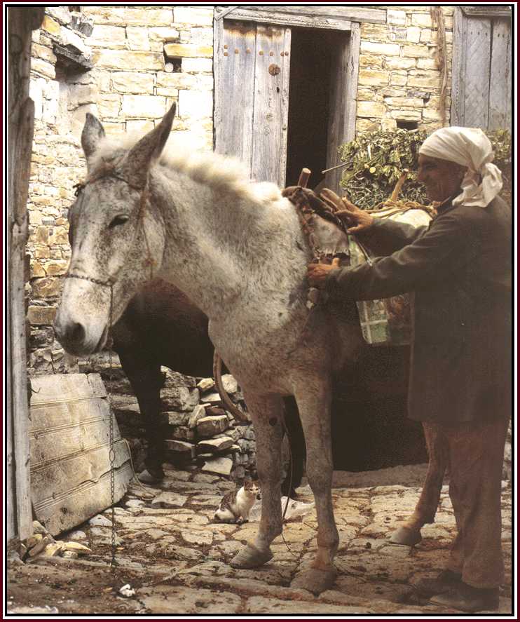 Hard-working Lefkaritisses produce lace outside the gates and in the shadow of the church of the Holy Cross whilst life goes by perhaps slowly on a donkey.