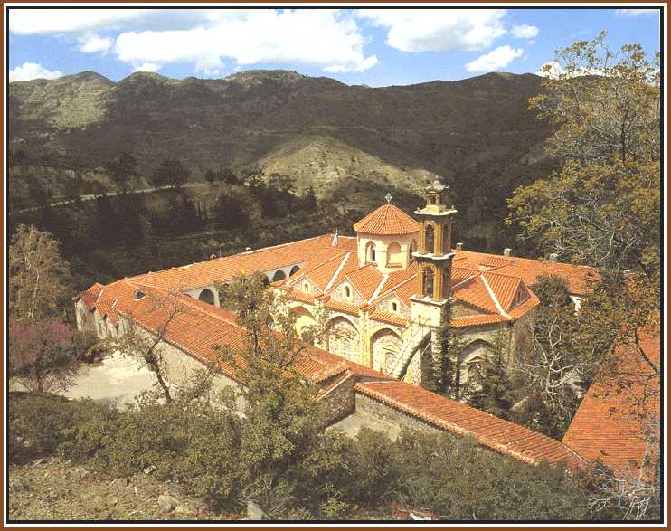 The Monastery of Makheras, on the northern slopes of Mt. Kionia, was founded c. 1148 with the help of a grant from the Emperor Manuel Comnenus. It was burnt down in 1530 and 1892, and rebuilt in 1900. Colourful legends as to the origins of monasteries in Cyprus abound. Makheras, it is said, owes its name to makheri Greek for knife or sword in allusion to the sharp icy winds that blow down the valley or the sword that the hermits Ignatios and Prokopios found alongside the miracle-working icon of the Blessed Virgin Mary. |