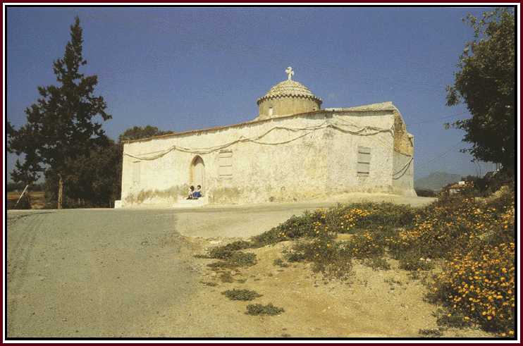 At the little Turkish village of Kivisili I came across the church of Panayia Eleousa girdled with strands of cotton thread in the customary manner in times of drought , when the villagers carry the icon of the virgin round the fields and pray for rain . |