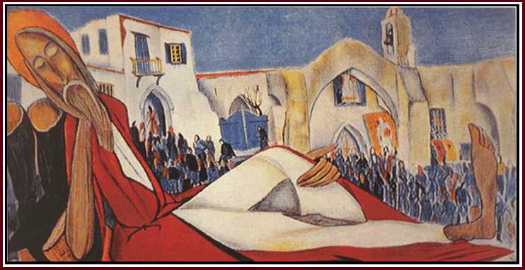The late George Pol. Georghiou, the island's internationally known painter, had a special affection for St. Spyridon, the local shepherd boy who became a bishop and who gained great fame for his eloquence and patronage of the deaf and the paralytic. Georghiou painted his great picture of the saint reclining and resting with his boots off in allusion to St. Spyridon's ability to walk over immense distances in ministering to his flock. |