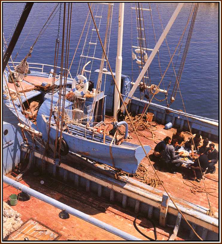 Trawlermen savour the day's catch at breakfast .