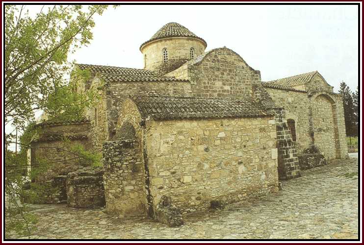 Fig. 17 : Despite many reconstructions and additions , most Byzantine churches retain a uniform exterior . Here is the Panagia Angeloktisti in Kiti from the rear . The main church has a tambour with windows below the tiled dome , the apse is surrounded by a second ring of tiles protecting the second wall added later from rainwater . |