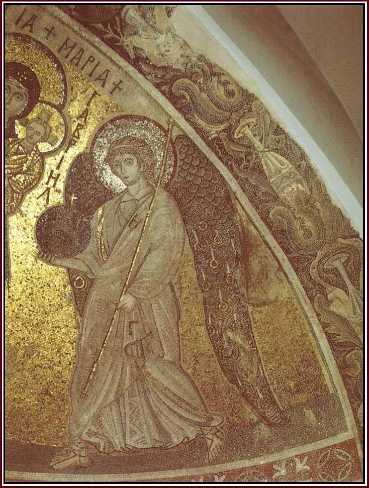 Fig. 20 : Wall mosaic from the period before iconoclasm , Archangel Gabriel from the apse conch in Kiti . He carries an orb decorated with a cross as a symbol for the fact that the scene is removed from earthly criteria .