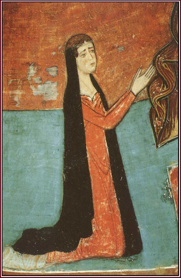 Fig . 5 : Frankish noblewoman from a donor's portrait in the narthex of Asinou . She is wearing the black veil usually worn by the ladies after the fall of Acre as a sign of mourning for the end of 'Outremer'.