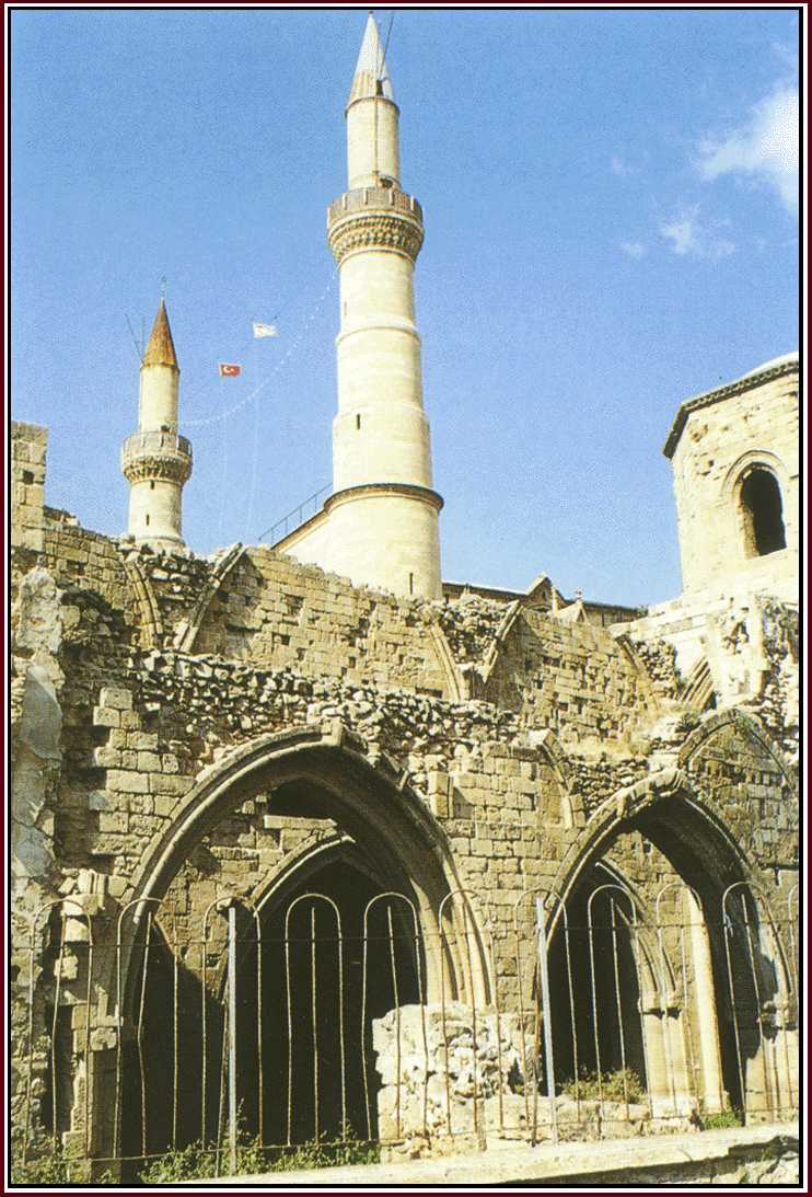 Fig . 7 : The gothic St. Sophia Cathedral in Nicosia , constructed 1208 - 1326 , coronation cathedral of the Lusignans , partially destroyed by earthquakes in 1491 and 1547 . After the Ottoman conquest , the minaret and the prayer niche pointing towards Mecca were added . Still the Selimiye Mosque today . |