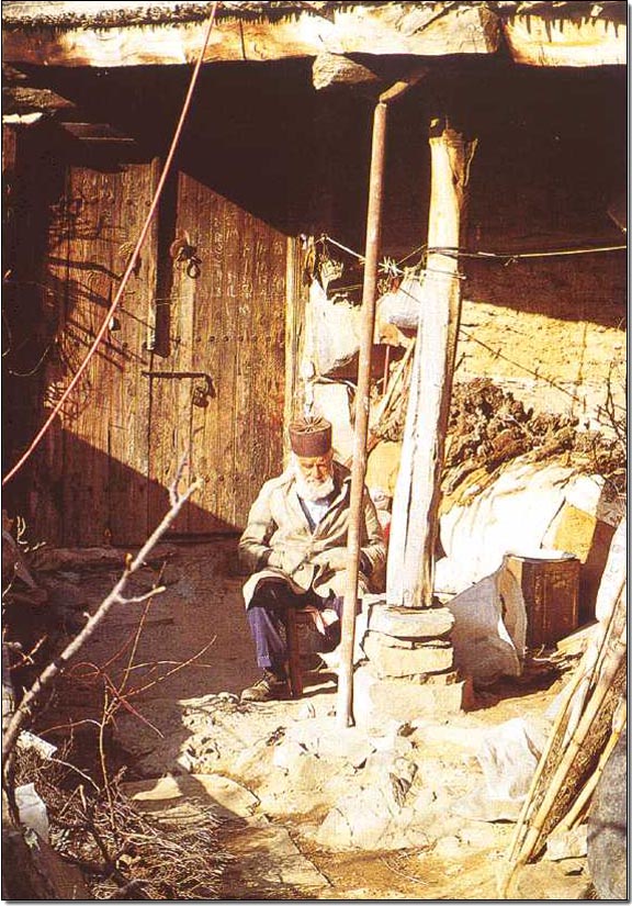 The very old priest in Fikardou is sitting outside in the courtyard of his house and enjoying the warmth of the winter sunshine.