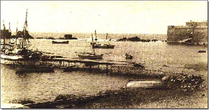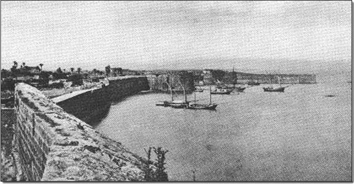 The port of Famagusta on the left is photographed from a south-eastern angle and we can see how it is all under the shadow of the city-walls. On the right it is the port of Kyrenia with its small fisherman's wharf.
