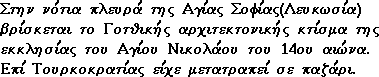 On the south side of the Selimiye Mosque-Ayia Sophia(Nicosia) is another interesting 14th century Gothic monument which is known as Bedesten. Bedesten is a Turkish word meaning "a covered market". It is so called because it was used as a market place for the sale of textiles during the Turkish rule. During the Venetian occupation it was the Orthodox Metropolis generally referred to as the Church of St. Nicholas. The north door (shown here) is an undamaged example of that period.  |